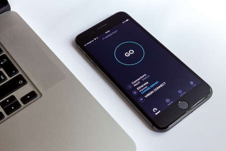 Moscow / Russia - July 13, 2019: Black iPhone 8 Plus and MacBook. On-screen program SpeedTest