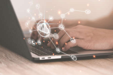 Hand typing on laptop keyboard to download and upload information data pass thru cloud computing.
