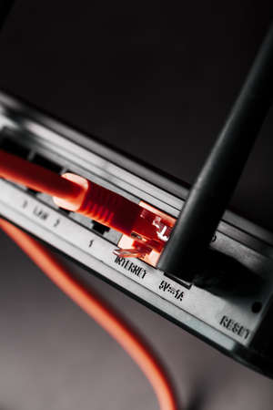 The red patch cord is inserted into the router's wifi port to access the Internet. Internet connection over a wire with a router.