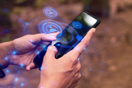Double exposure of technology hologram and hand with cell phone on background. Research and development software concept