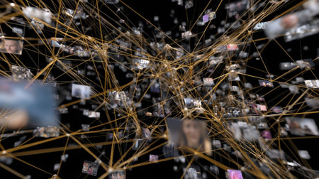 An array of interconnected neural network nodes visualized as a complex web processing digital frames from political debates showcasing data flow and analysis in an abstract representatio