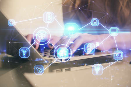 Double exposure of woman hands typing on computer and social network theme hologram drawing. People media concept.