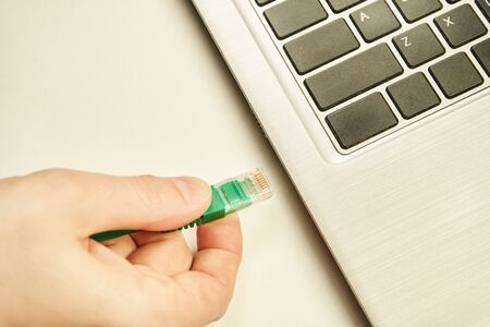 A hand gently grips a vibrant blue network connector, subtly emphasizing connectivity, with an out-of-focus laptop and a warm wooden workspace setting.