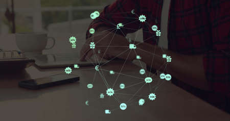 Image of globe with network of connections with digital icons over man using tablet. global connections, network, technology and digital interface concept digitally generated image.