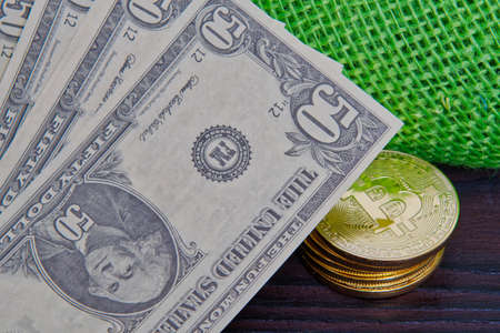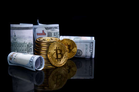 Background with Bitcoin cryptocurrency coins and US Dollar. Bitcoin cryptocurrency concept, Bitcoin BTC virtual money and US Dollar banknotes.