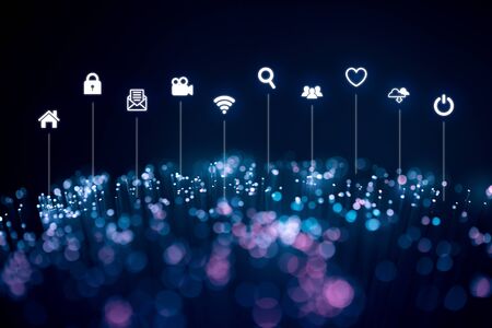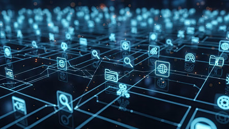 This image showcases an intricate network featuring illuminated icons, symbolizing digital concepts. The composition employs a grid pattern with interconnecting lines and a dark background. The scene suggests a technology-driven environment, possibly related to data, communication, or virtual spaces. Suitable for illustrating innovation, networking, and digital transformation in various commercial contexts.