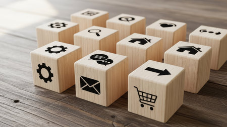 This image features several wooden cubes, each displaying a different black icon. The cubes are arranged on a textured wooden surface. The lighting appears natural, enhancing the visibility of the icons. The composition suggests organization and structure, suitable for illustrating business concepts or design elements.