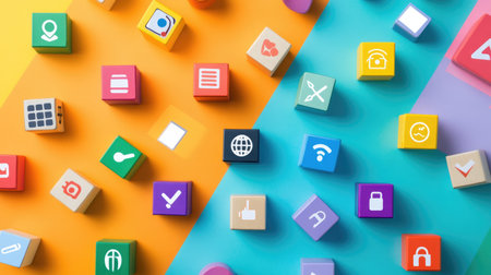 Bright and colorful digital icons arranged on a vibrant backdrop symbolize technology and connectivity, ideal for digital media themes and marketing materials.
