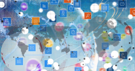 Image of globe, world map and tech icons over blue background. Global network, data processing, and technology concept digitally generated image.