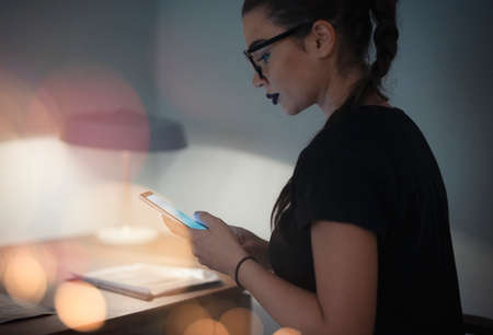 Young concentrated woman, sitting in her room or office.Studies late at night.Staying up late. Overworking. Working late on laptop.