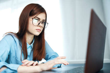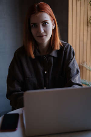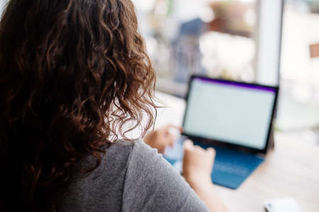 Young attractive woman is sitting in front of an open laptop in a coffee shop. Modern young business woman is working on a new project, looking at the screen of a portable computer.