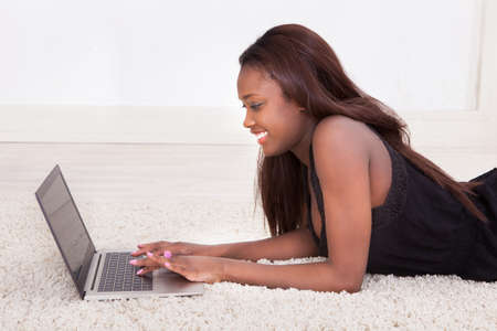 Side view of young woman using laptop while lying on floor at home