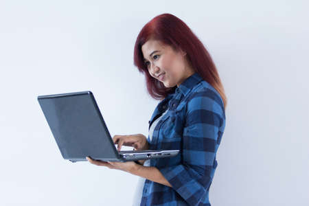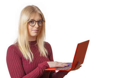 Smiling caucasian young woman using laptop isolated in white background. Horizontally.