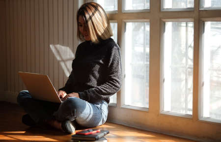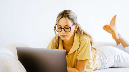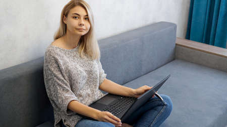 Casual young woman using laptop in living room at home. Working from home in quarantine lockdown