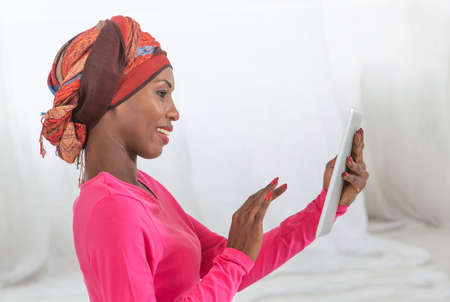 African woman relaxing with tablet