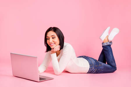 Full body photo of charming lady lying floor speaking skype with relatives wear white pullover and jeans isolated pink color background