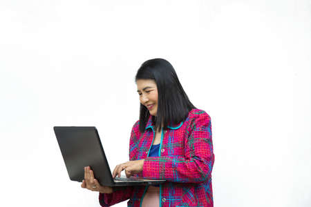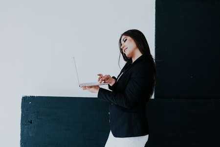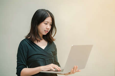 Closeup Asian beautiful woman Wearing a black shirt standing around the gray wall Use a laptop computer to work happily