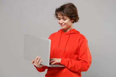 Smiling young brunette woman girl in casual red hoodie posing isolated on grey background studio portrait. People sincere emotions lifestyle concept. Mock up copy space. Working on laptop pc computer.