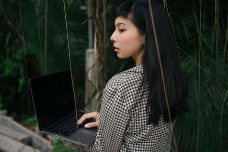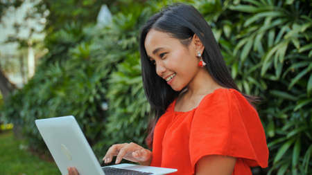 Young Indonesian girl with a laptop in hand in the park.