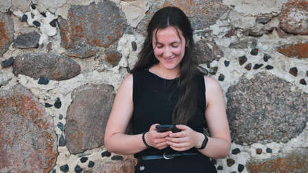 Girl with a phone on the background of a stone wall.