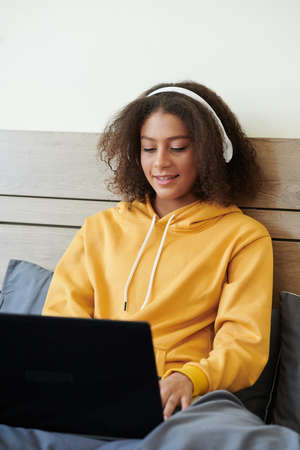 Positive teenage mixed race girl with curly hair sitting in bed and listening to music while chatting through social media using laptop