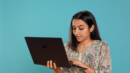 Woman composing email, carefully typing on laptop keyboard, struggling to think of what to write. Indian person sending mail online, brainstorming message idea, studio background, camera B