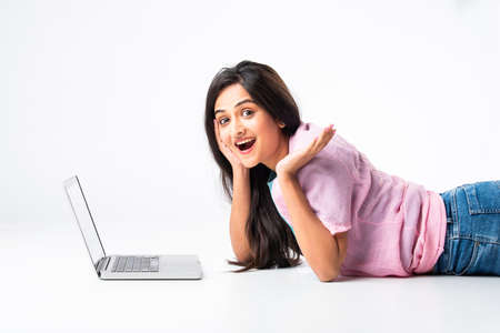 Indian pretty woman or girl using laptop or notebook lying on white background