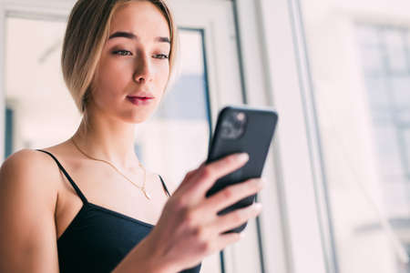 Woman using smartphone viewing online shop on mobile phone browsing data, close up hands. Russia. Saint-Peterburg 2022, February 20