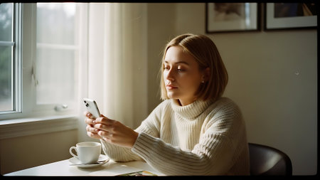 Young woman drinking coffee and using mobile phone in a cafe at home