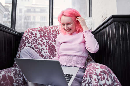 Girl with pink hair sitting on armchair at home and talking with friend