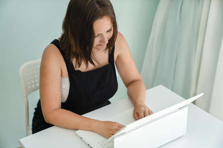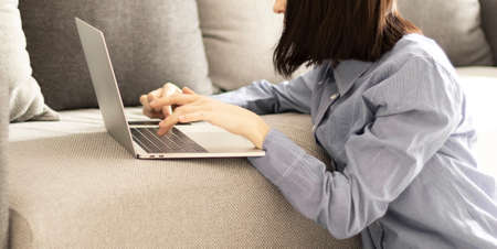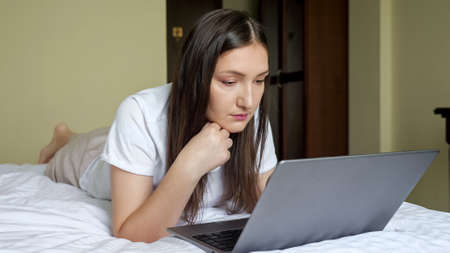 Woman reading news on a laptop at home. Online Shopping, distance work or online education concept