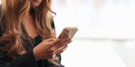 Partial image of woman face holding mobile phone and texting
