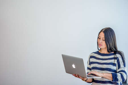MINSK. BELARUS - SEPTEMBER 2015: Pretty woman in a striped sweater works on Apple laptop against gray wall background. High quality photo