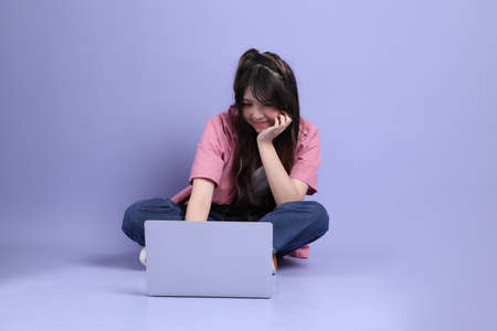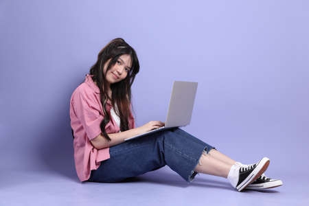 Young Asian woman sitting and using laptop on blue background