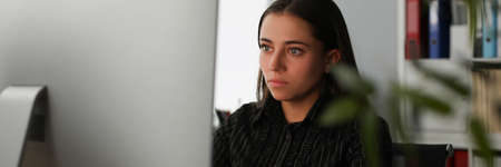 Young office worker stare at computer screen, search information online