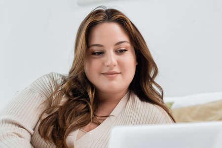 Smiling plus size woman looking at blurred digital tablet at home