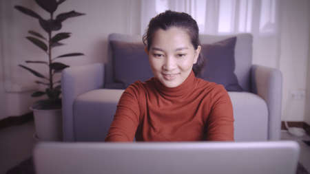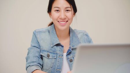 Asia business woman feeling happy smiling and looking to camera while relax at home office. Young asian woman working using laptop on desk in living room at home.