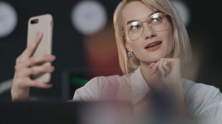 Attractive business woman smiling for selfie in dark office. Blond woman posing for selfie photo on mobile phone in business office. Smiling woman taking mobile photo at workplace