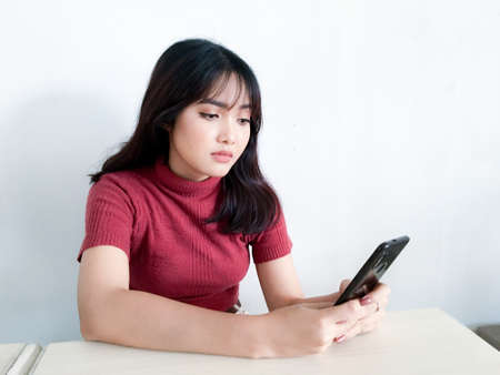 A young Asian woman taking a break from work and checking her mobile phone at her workplace.