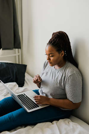 African american young woman using laptop on bed - technologies and communication and social network concept