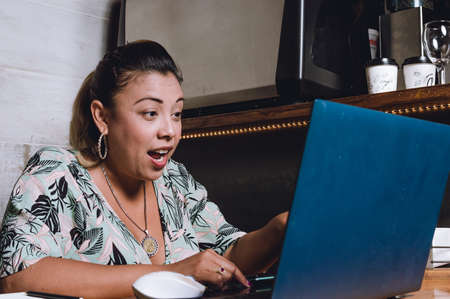 young adult hispanic latin brunette woman surprised using her computer shopping on the internet, sitting in a coffee shop, shopping online with discounts and offers.