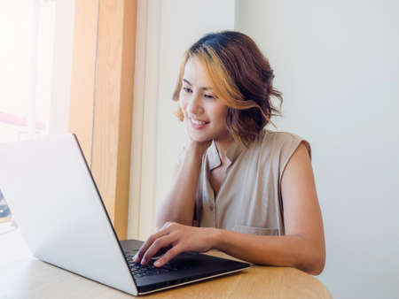 Asian woman, freelance with trendy short hair and look cool looking at the screen while working with laptop computer on a round wooden desk on white wall background, near the window glass at the cafe.