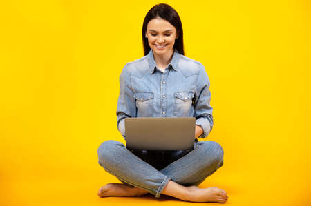 Beautiful young caucasian smiling woman in casual denim outfit, sitting on isolated orange background and working online on her laptop, replies to email, types a message