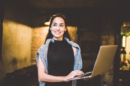 The concept of small business and technology. Young beautiful brunette businesswoman in black dress and gray sweater stands in coffee shop with laptop in hands. On the head glasses for sight.