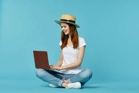 woman with laptop learning internet online education blue background
