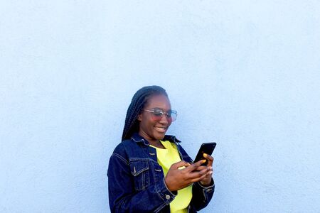 the Happy African American with phone on blue background