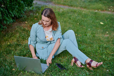 beautiful girl working on a laptop on the grass