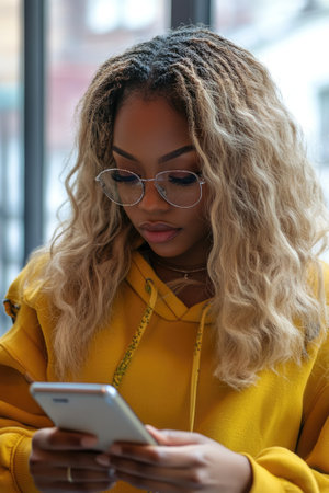 Focused young woman with long blond curly hair wearing glasses and yellow hoodie using smartphone