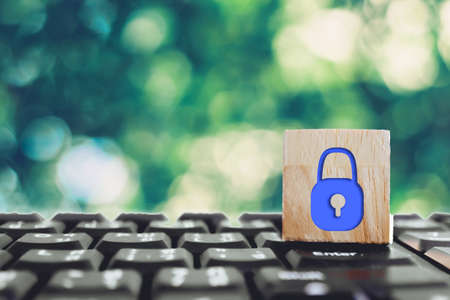 Closed up lock icon as security show on wood cube on computer keyboard. Protect safety on network activity business technology concept.