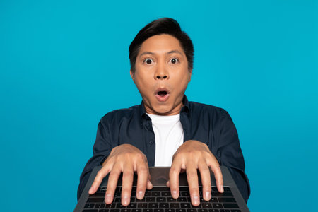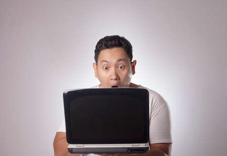 Shocked and surprised face of Asian man looking at the laptop in his hand.